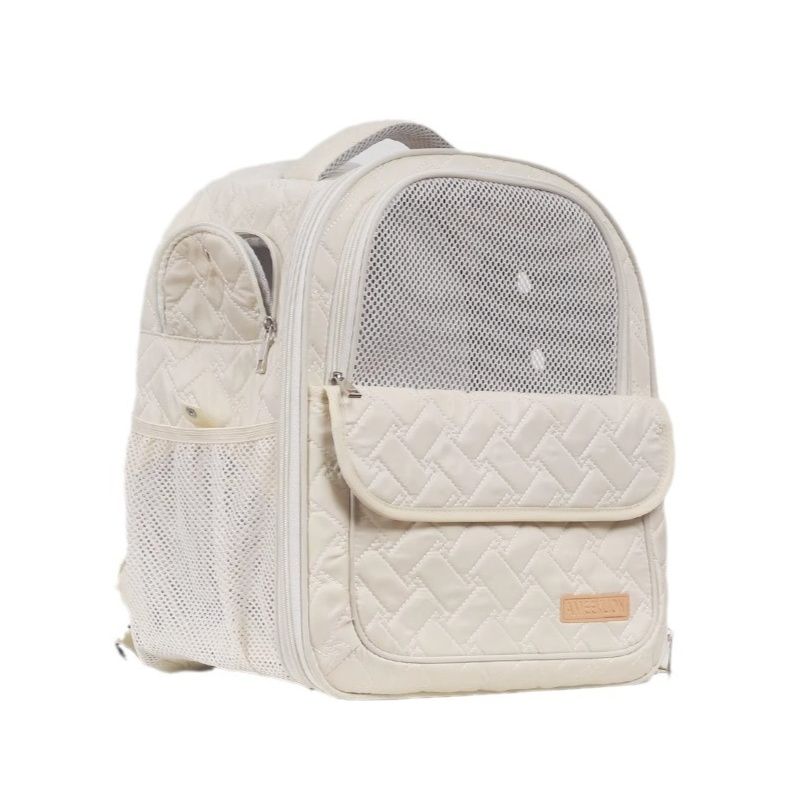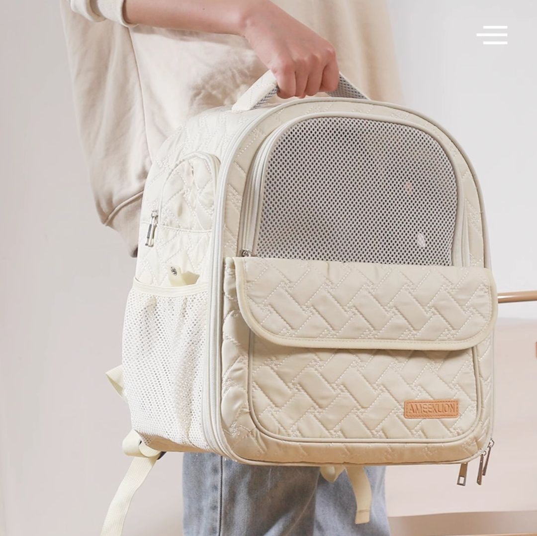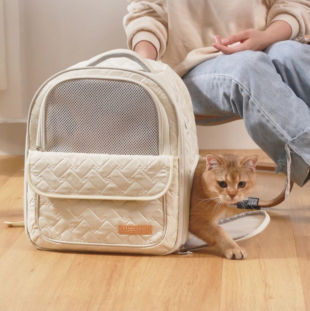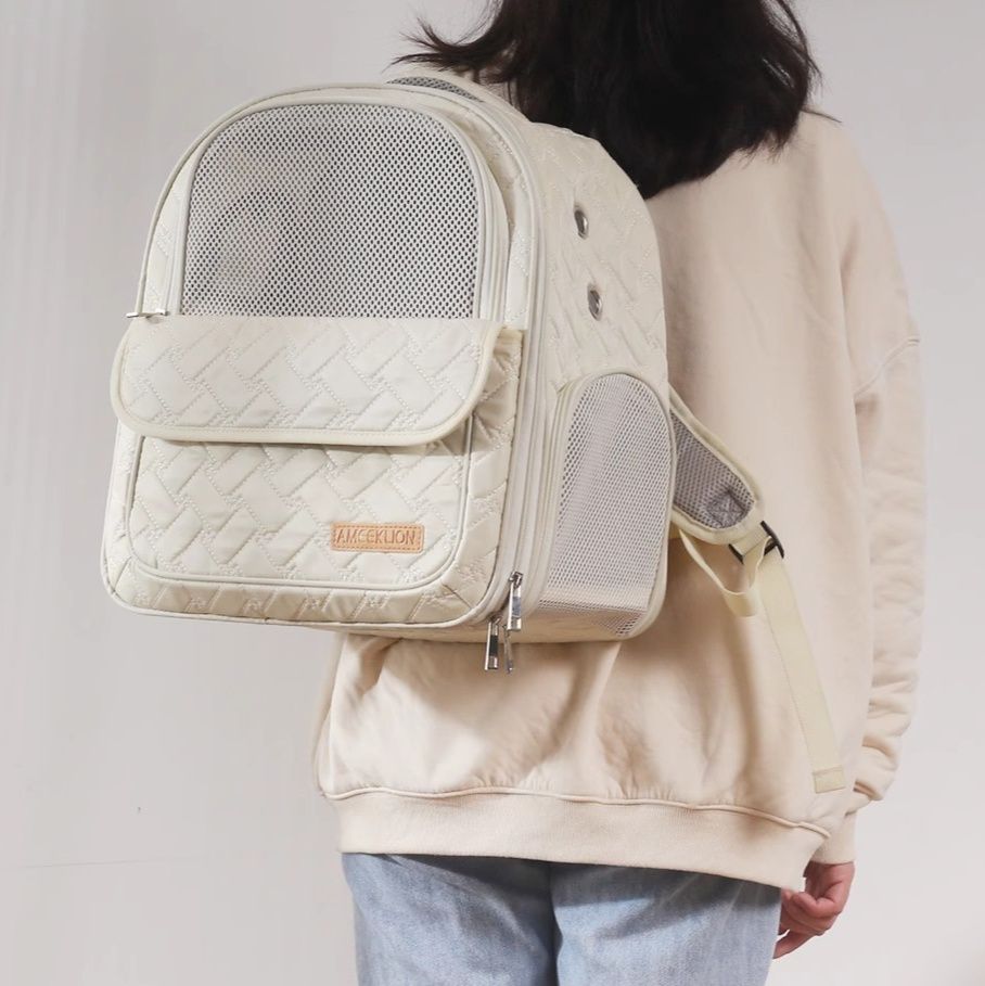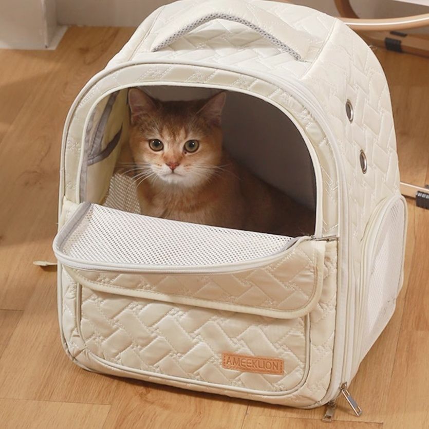 愛猫とのお出かけに最適な猫キャリーバッグのリュックです。 前面にメッシュ窓を配置し通気性を確保しながら、キルティング加工を施した上品なデザインに仕上げました。 肩掛けと手提げの二通りの持ち方ができ、長時間の移動も快適です。 サイドポケットや底面の安定感など機能性も充実しており、動物病院への通院や旅行にも安心してご使用いただけます。