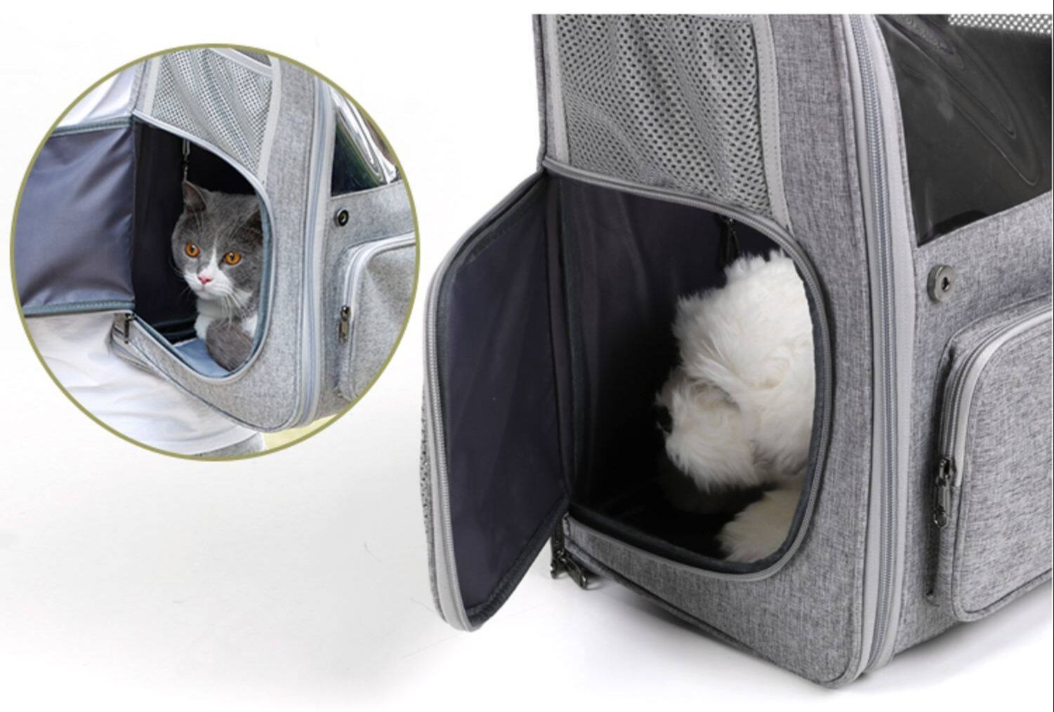大切な愛猫とのお出かけに最適な猫キャリーバッグのリュックタイプです。 通気性抜群のメッシュ窓が複数配置され、猫ちゃんの様子を確認しながら快適に移動できます。 側面には大きな開口部があり、ペットの出し入れもスムーズです。 前面と側面には小物や餌などを収納できる便利なポケットが三箇所付いています。 クッション性のある肩紐で長時間の移動も楽々、動物病院や旅行に大活躍します。