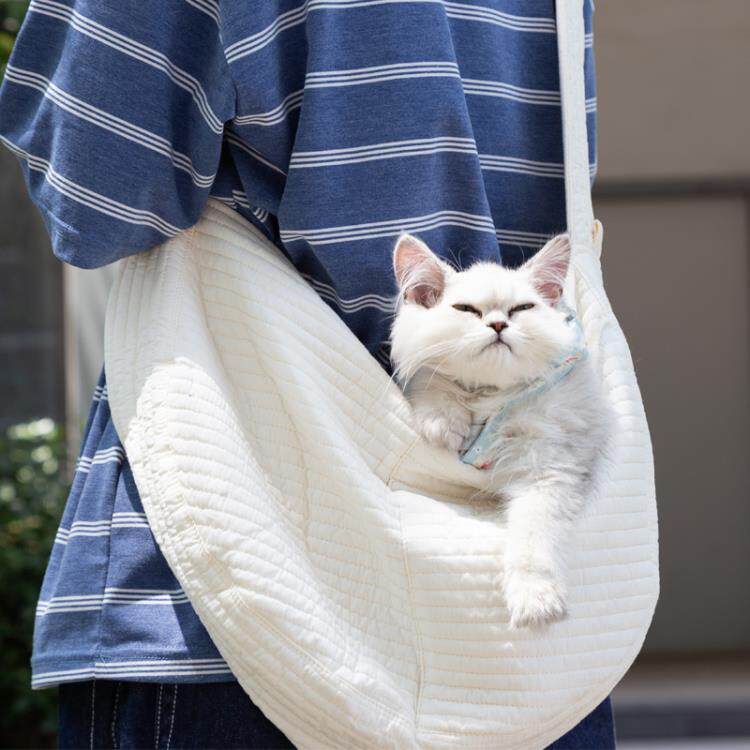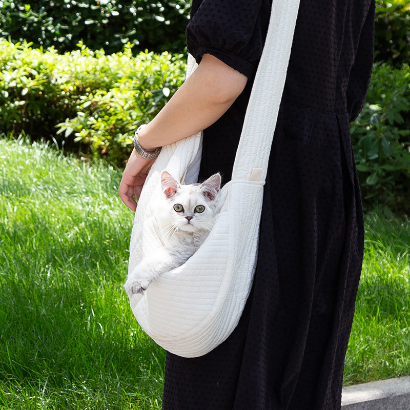 柔らかなコットン素材で猫ちゃんを優しく包み込み、肩掛けで両手が自由に使えます。